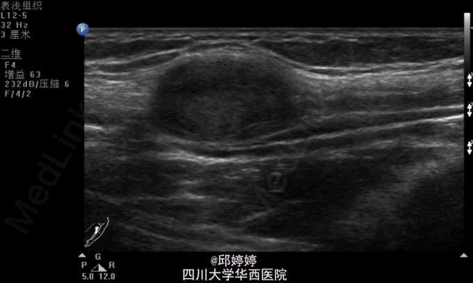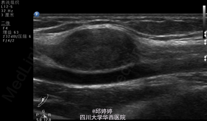 视:左上臂无明显畸形及肌萎缩,肌力5级。无色斑、窦道。触:左上臂近端肱二头肌内侧正中神经可摸及约蚕豆大小的肿物,压痛,并向左上肢及中指放射,活动度不大,与正中神经粘连,Tinner征阳性。动量:左肩、肘、腕关节活动自如。辅助检查:左上肢包块彩超:左上臂包块处查见大小约25*11*16mm的弱回声团,边界清楚,该团块与正中神经相连,内未见明显血流信号(图1,2)。超声诊断提示:左上臂实性团块:神经源性肿瘤?