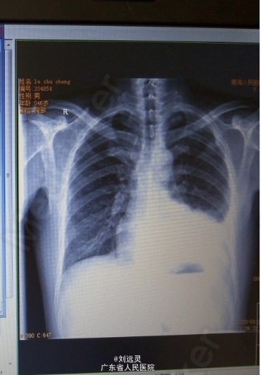 男,46岁。 因"低热、咳嗽10余天"入院。 患者于10余天前在无明显诱因下出现发热,最高体温37.5℃,无畏寒寒战,以夜间出现,伴咳嗽,程度轻,咳少许白色粘痰,痰中无带血丝,无铁锈色痰,无胸痛,曾在当地医院治疗,予抗病毒,抗感染等治疗,(具体不详),但症状缓解不明显,行胸片示:左肺炎并左侧胸腔积液。今为进一步治疗,拟"左下肺炎"收住本科。