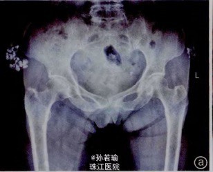 患者,女,78岁,双髂部疼痛,不能侧卧1个月。无发热、消瘦乏力,无外伤史。于我院门诊行X线检查提示:双髂骨外侧高密度钙化影,边界清(间图1a)。