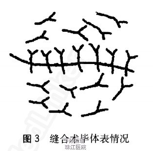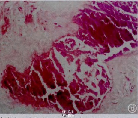 诊断:双髂部巨大瘤样钙盐沉积症TC 择期在蛛网膜下腔阻滞麻醉下行肿物探查切除术。术中见肿物位于双髂部皮下,呈圆饼状,均8cm×6cm大小,无囊壁包裹、与肌肉无粘连,其内为乳白色糊状钙化组织(图1c)。彻底切除肿物。刮净、止血、冲洗,采取渔网状全层缝合法闭合创面(见图2、图3),手术切口一期愈合,术后恢复良好。病例报告:肉眼可见坚硬的钙化肿块,可侵及肌腱和肌肉,其内有白色或黄白色颗粒样物质;镜下可见无定形或颗粒状的钙盐沉积,周围被致密结缔组织包绕(见图1d)。