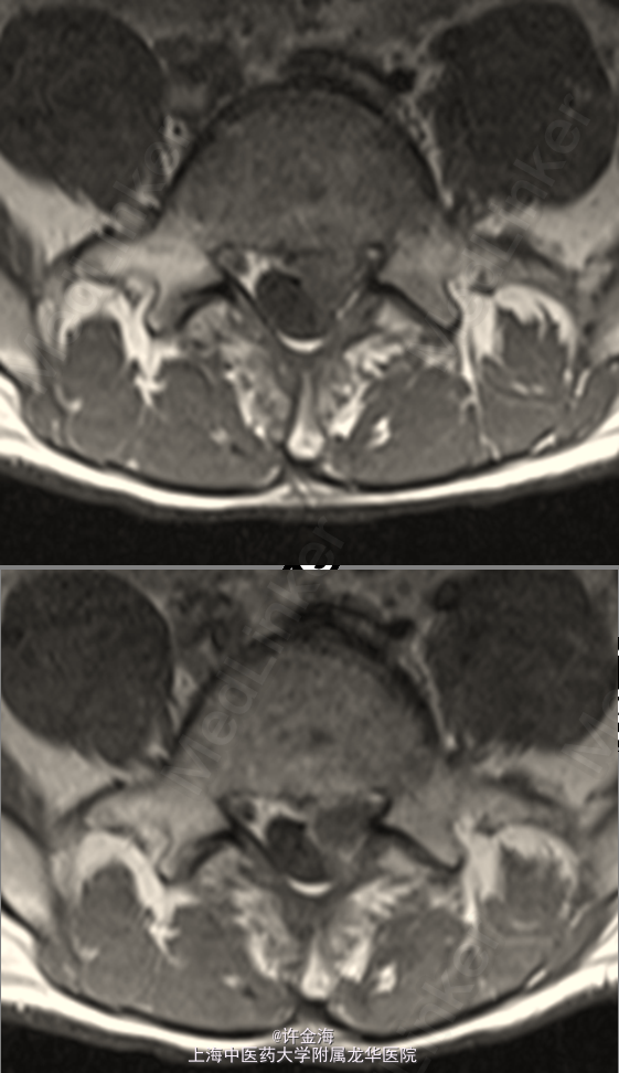 检查:L4/S1棘突、左侧棘旁压叩痛(+),左直腿抬高试验15°,加强(+),左4字试验(+),左下肢踇伸、跖屈IV级;浅感觉对称存在,双侧跟膝腱反射(+++),病理征(-)。