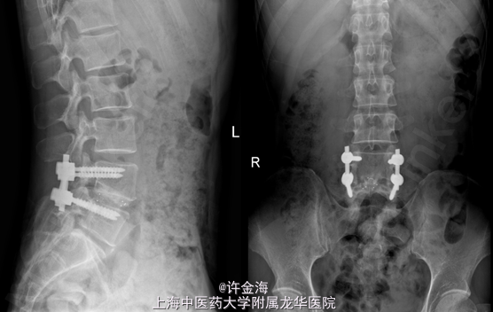 腰椎间盘突出症 术前:VAS腰6分,VAS腿8分,JOA12分 行全椎板切除减压,椎间盘摘除,cage融合,植骨内固定