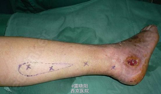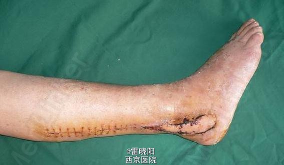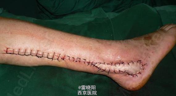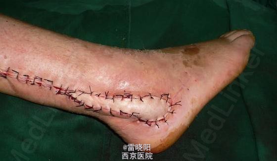 行腓动脉穿支逆行岛状皮瓣(腓肠神经营养皮瓣)修复。