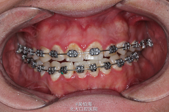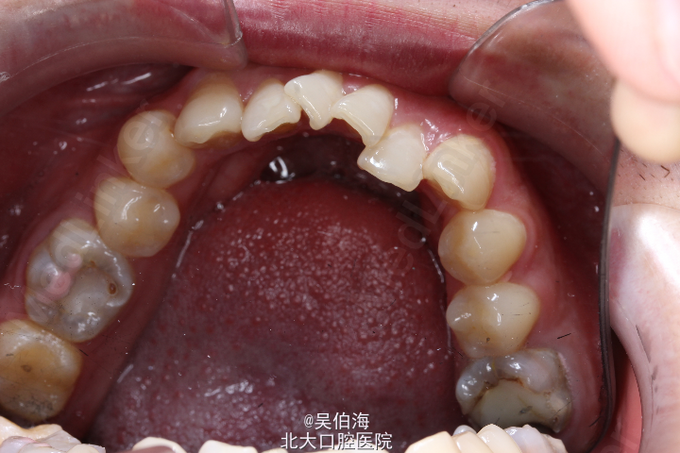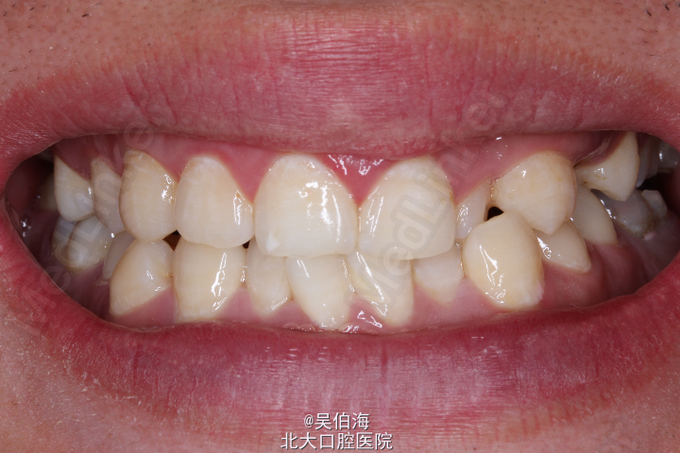 诊断:下牙列重度拥挤。处理:拔除36残冠,排齐整平下牙列.。排齐时先不纳入32,待其他牙排齐后用推簧开展32间隙,再纳入排齐。