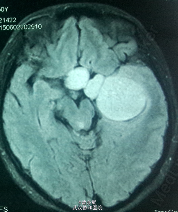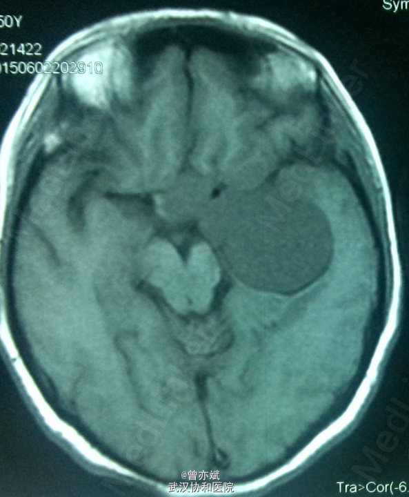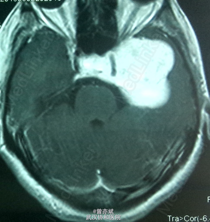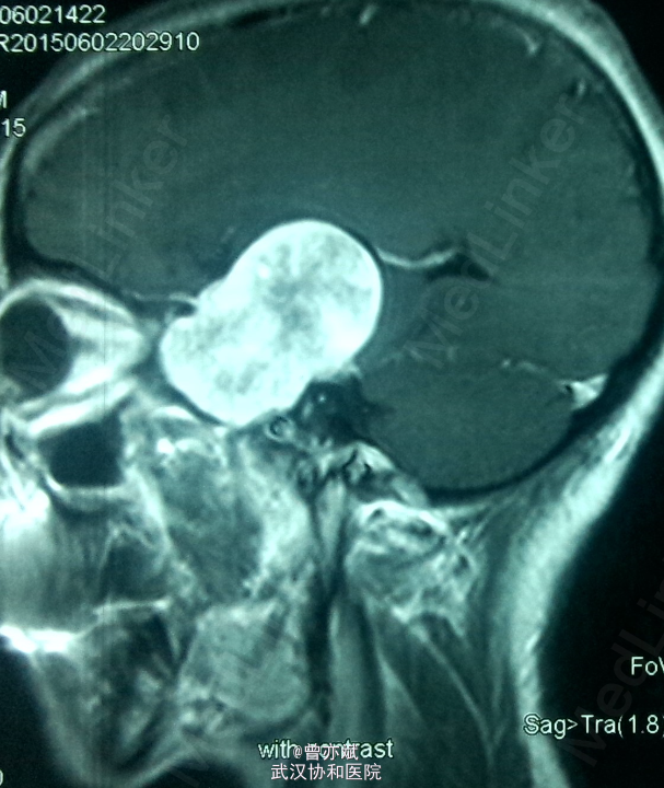 查体:左眼视力0.8 颞侧偏盲,右眼视力 0.5 余无明显阳性体征。既往无特殊。 MRI: 稍长 T1,高flair信号,增强明显强化 ,其内点片状强化减低区。诊断:鞍区、中颅窝底巨大占位,考虑脑膜瘤可能性大。