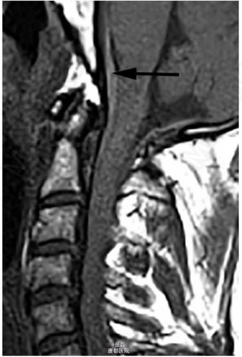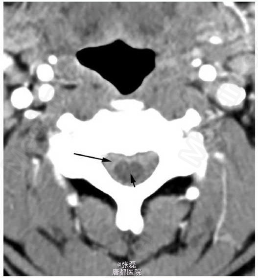 急诊行 T1-T5 椎板切除术与减压术。术后诊断为蛛网膜下腔出血肿块在髓内扩大,导致脊髓受压以及神经系统功能障碍。病理检查提示为血肿。随后,患者接受了脊髓血管造影进一步评估可能的出血源。血管造影未发现动静脉畸形或其他血管畸形。