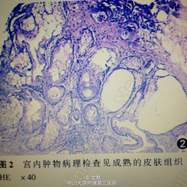 2013年2月6日在硬膜外阻滞麻醉下行宫腔镜检查,见:宫腔内子宫体部后壁有一约2.5 cm×2.0 cm×1.0 cm大小的息肉样凸起组织块,病理检查大体观:切除的组织块色偏黄,质软。病理检查结果提示:(宫内物)见成熟的皮肤组织、脂肪组织和纤维组织,部分被覆子宫内膜组织,符合成熟畸胎瘤。术后诊断:子宫黏膜下成熟畸胎瘤合并卵巢早衰。