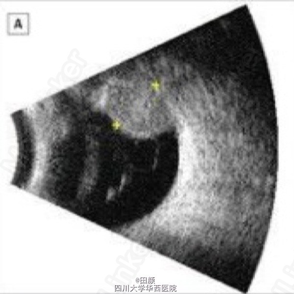 患者女,70多岁,4余年前因左眼间歇性闪光感、眼前黑影飘动以及无痛性视力下降就诊。当时右眼视力0.8-2,左眼0.5。眼底检查可见脉络膜黑色素瘤位于11点至1点处,位于睫状体与赤道之间。
