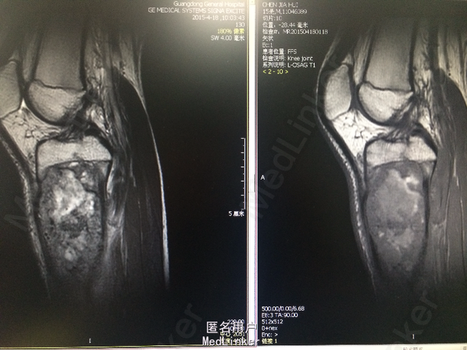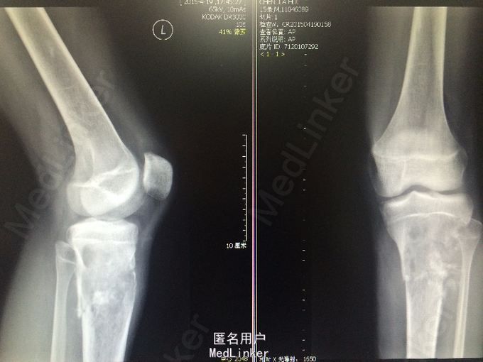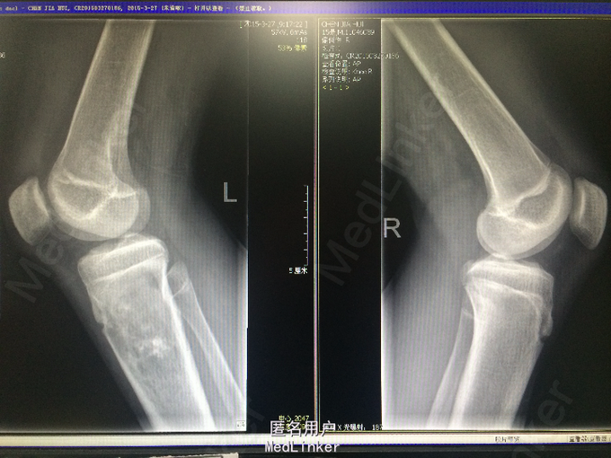青少年男性 主诉:扭伤左小腿后反复疼痛4月,加重伴肿胀2周。 病史:患者于4月前跳舞时不慎扭伤左小腿上段,后出现左小腿疼痛,呈酸痛性质,呈间歇性,无明显加重及缓解因素,无夜间疼痛加重,无伴发热、盗汗,当时程度较轻,未予重视。2周前患者无明显诱因出现症状加重,并觉左小腿上段肿胀,无局部红肿、发热,无伴关节活动受限,遂于当地医院就诊,查X线提示左胫骨近侧干骺端占位性病变,考虑来源于软骨类肿瘤可能性大。行左小腿MR平扫+增强提示:左侧胫骨上段占位性病变 ,考虑恶性骨肿瘤(骨肉瘤)。现为进一步诊治就诊于我院,患者自起病以来,无发热,无咳嗽、咳痰,大小便正常,体重无明显变化。
