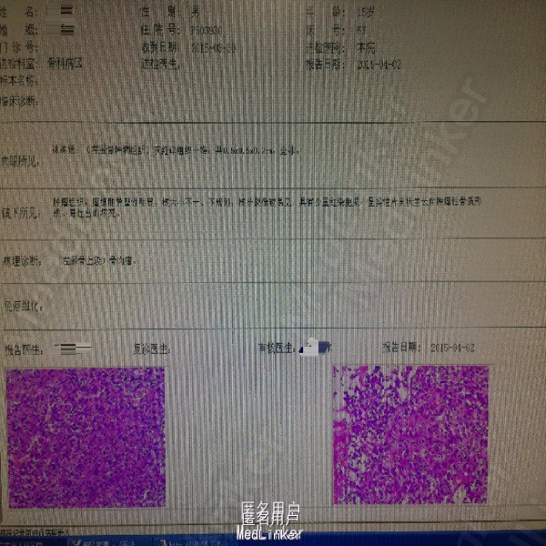 诊断:恶性骨肿瘤:骨肉瘤? 处理:完善相关检查,局麻下行左胫骨肿物穿刺活检术,病理诊断为骨肉瘤。遂进行AP方案诱导化疗,其中吡柔比星针(合)40mg d1-2+顺铂针 30mg d1-5,过程顺利。后患者肿瘤疼痛加重,予止痛治疗,住院期间下床时不慎扭伤左下肢后疼痛加重,行左膝关节X光检查提示病灶部位骨折,断段对位对线上课,暂予止痛、夹板固定,择期手术治疗。后行全麻下左大腿截肢术。术后予止痛、补液、预防感染等治疗,患者恢复良好。