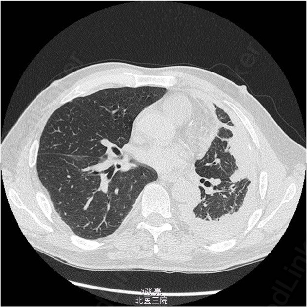患者,男性,64岁,因进行性呼吸困难、胸闷、咳嗽咳痰而入院。职业为造船技师,有石棉暴露史。无吸烟史。