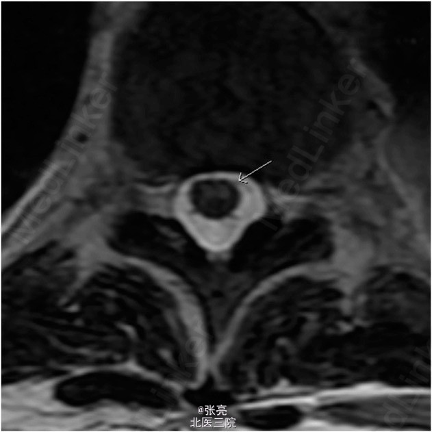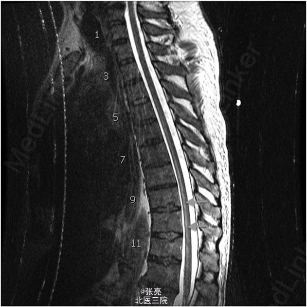 胸腔镜活检确诊为恶性胸膜间皮瘤。患者接受了四个疗程的化疗(顺铂/陪美曲塞),影像学随访显示肿瘤体积逐步缩小。超声引导内镜针吸活检纵隔淋巴结提示无转移。患者一般状态及心肺储备良好。故决定行胸膜外全肺切除术。 顺利在左侧脊柱旁T5到T6节段水平植入导管。给予患者双腔气管内插管,桡动脉和中心静脉置管。患者取右侧卧位,取左侧后外侧切口。肿瘤超出了胸膜覆盖范围,广泛侵犯主动脉周围,但主动脉和肿瘤之间界线清楚。 胸膜外全肺切除术进展顺利,整块切除了受累肺组织、纵隔淋巴结、左侧膈肌和同侧受累的局部心包膜。对T3到T6节段水平的同侧上段胸椎节段动脉进行缝合结扎及电凝切断。相应节段平面和神经管无活动性出血。 给予2 mm的聚四氟乙烯(GROE-TEX)补片修补缺损的膈肌和心包。止血良好。总出血量估计在1300 ml,输注5个单位的浓缩红细胞。术后患者转入ICU,给予小剂量0.5 mcg/kg/min的去氧肾上腺素维持血压。 到达ICU时,患者血流动力学稳定,神经功能完整。手术当晚,患者经历了两次短暂的低血压过程,每次持续不到1min,收缩压降低至60-70 mm Hg。给予输液和调整升压药剂量好有效维持血压。 第二天早晨,护士发现患者双下肢不能活动。体格检查发现双下肢瘫痪,感觉保留。MRI提示,脊髓中枢T5到T12节段水平T2异常高信号,无脊髓硬膜外血肿或脊髓压迫。这些表现与脊髓缺血相一致。 立刻给予患者改善脊髓灌注的标准治疗方案。维持平均动脉压在80mmHg,麻醉师行腰大池引流,降低脑脊液压力至10cmH2O以下。在接下来的2周中,患者下肢运动功能略有改善。但功能上仍截瘫,有大小便失禁。 术后17天,患者转入康复医院接受进一步治疗。