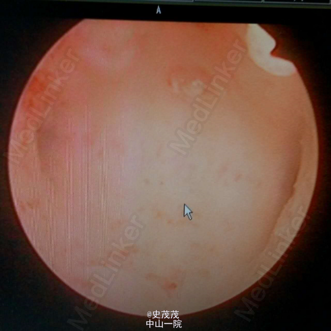 诊断:继发性不孕。 处理:完善相关检查后行宫腔镜检查术,术中见:宫深7.0cm,子宫颈管光滑,宫腔形态规则,内膜中等厚度,光滑,双侧宫角及输卵管口可见。予分段诊刮,组织物送检。镜下诊断:大致正常宫腔。过程顺利。