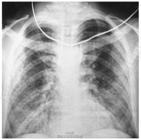 41岁男性,HIV携带者,发热、咳嗽、进行性加重呼吸困难4月就诊。胸片可见弥漫性、双侧胸部网状结节影。
