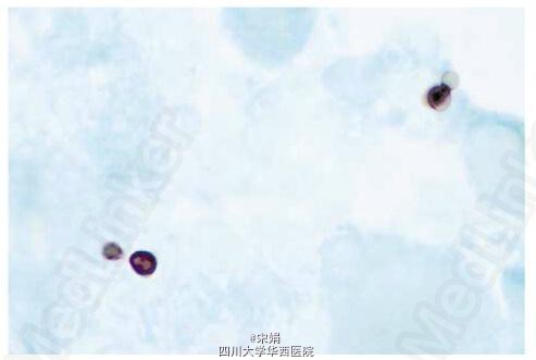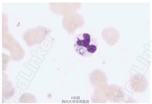 血涂片(入院时)发现分叶核中性粒细胞有胞内病原体。这些酵母样病原体有清晰的晕环,即可能存在包膜,形态符合组织胞浆菌。