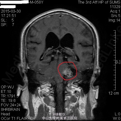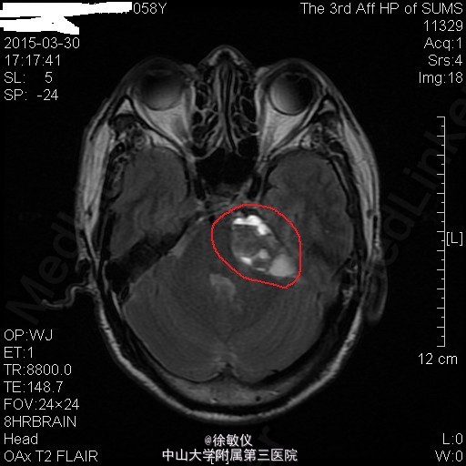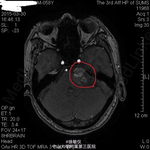 查体:左耳听力缺失,右耳听力正常。余查体无特殊。 辅查:头部MR:1、左侧桥小脑角区占位病变,考虑为听神经瘤并出血、囊变,病变与左侧听神经、椎动脉关系密切;2、颅脑MRA示脑动脉未见异常。 头部CT:双侧额顶枕叶、半卵圆中心、侧脑室周围、放射冠、基底节区及右侧岛叶多发密度灶,考虑缺血变性灶;颅脑CTA示肿瘤与左侧椎动脉关系密切。