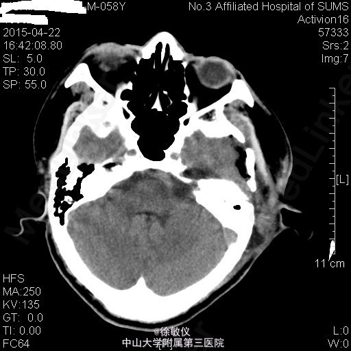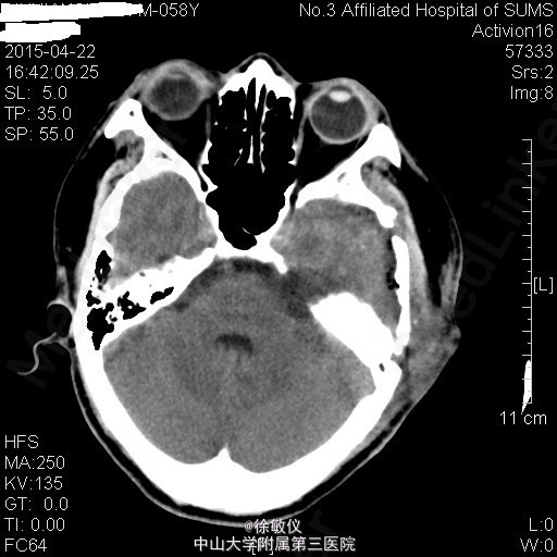 老年患者,主诉:左耳耳鸣、听力下降8年,伴头痛2个月。 现病史:患者8年前始无明显诱因反复出现左耳耳鸣,自诉如鞭炮样鸣响,伴听力进行性下降,无耳道流血流液,可自行缓解。患者曾至当地医院就诊,保守治疗后改善不明显。2个月前始患者出现阵发性全头痛,偶伴头晕、恶心,近2周呕吐胃内容物2次,无发热,无肢体活动异常等不适。于当地医院行头部CT,结果提示:左侧桥小脑角区占位性病变伴出血,听神经瘤(神经鞘瘤)可能性大。患者为进一步治疗来我院。