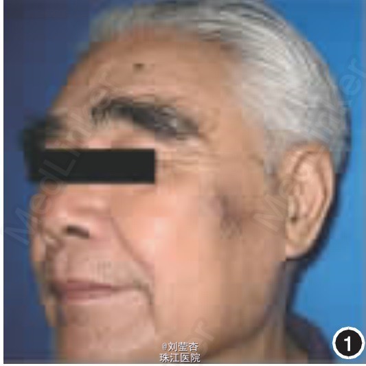 患者男,75岁。 左颧部结节2年余。2年前无明显诱因, 患者左颧部出现一个黄豆大结节,无自觉症状,渐增大。 患者有高血压病史10年,无其他特殊病史,无家族遗传病史,家族中无类似患者。