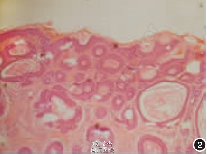 随访:术后2年随访无复发。 讨论:毛发腺瘤是一种少见的皮肤良性肿瘤。毛发腺瘤多发于面部,其次发生于臀部。 其他少见发于颈部、上臂、大腿、肩部、眼睑、上唇及阴茎。毛发腺瘤大小通常在0.3*5.0 cm之间, 因临床表现无特异性而常被误诊。 临床上要注意与基底细胞癌、表皮囊肿、 结缔组织增生性毛发上皮瘤及微囊性附属器癌相鉴别。 DOI:10.3760/cma.j.issn.0412-4030.2015.05.012