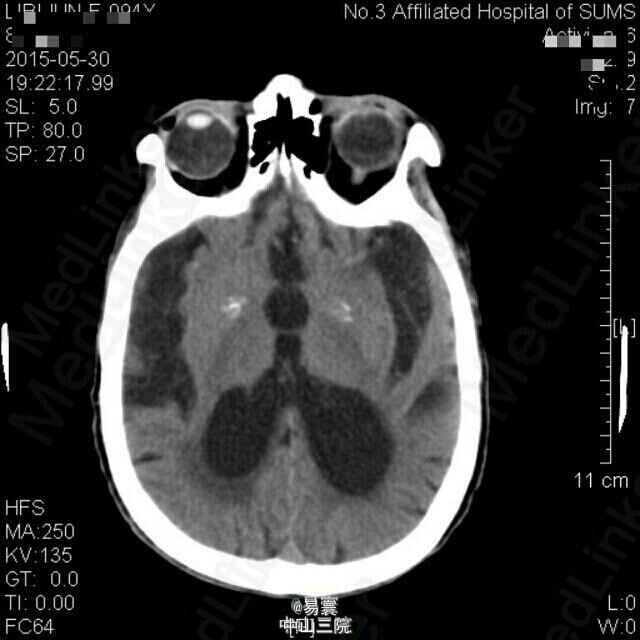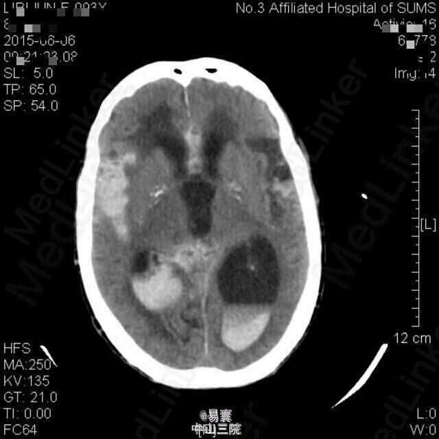 随访:患者现意识仍模糊。 讨论:患者老年女性,脑梗后出现脑出血,出血之前并未予以强力抗血小板药物,仅20mg阿司匹林口服,且院外患者长期服用抗血小板药物,有多发性脑梗病史,考虑与患者年龄大血管硬化有关。出血量较大,积极脱水降颅压,现患者一般情况仍差,分享病例同时想问问同行有什么好的处理方法。