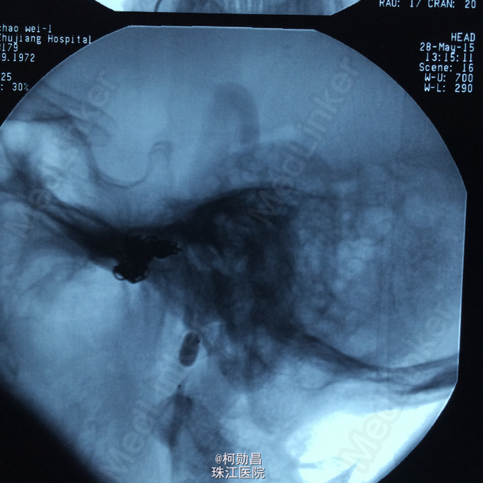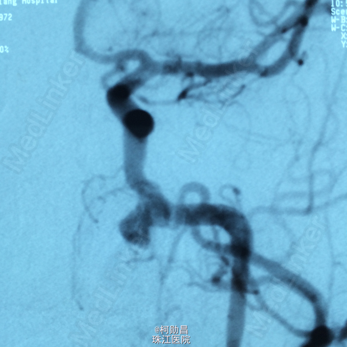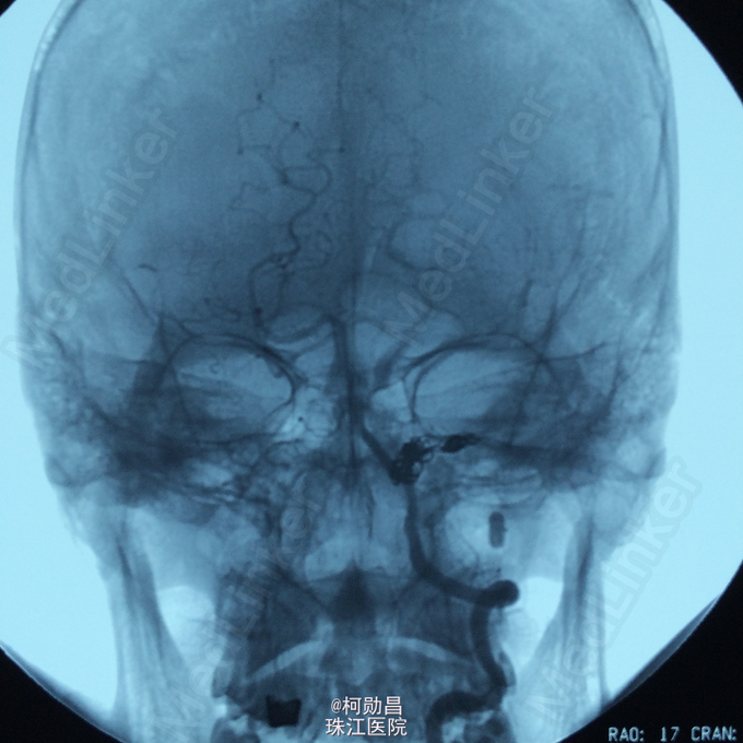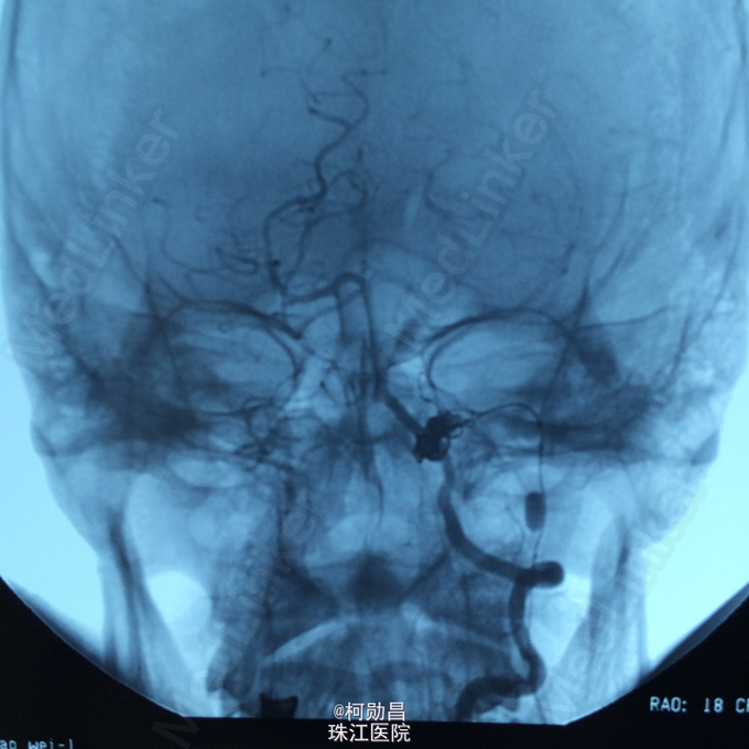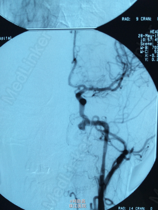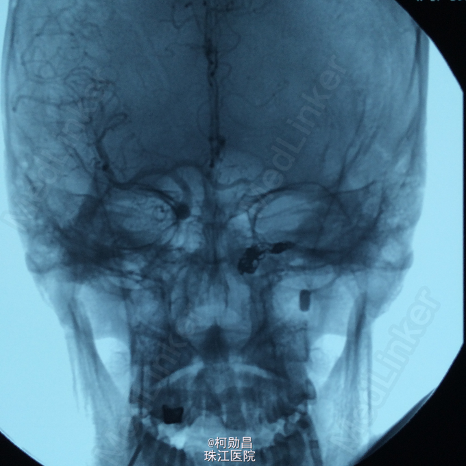 诊断:颈内动脉假性动脉瘤破裂 处理:急诊行DSA检查,提示颈内动脉海绵窦段动脉瘤形成并破裂向鼻腔引流,予血管内栓塞治疗,将动脉瘤腔堵塞,患者出血停止。
