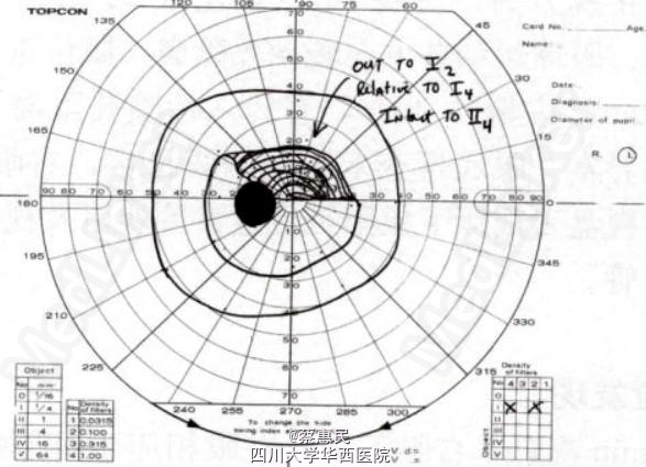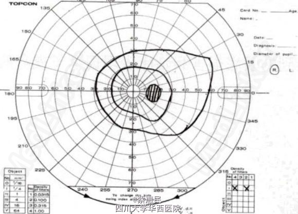 最佳矫正视力:右眼20/20,左眼20/20、外观无异常,无突出。眼球运动正常,眼位正。瞳孔大小右眼3.5mm,左眼4.0mm,有传入性瞳孔阻滞(++)。裂隙灯检查无异常,眼底检查双眼视网膜正常,右眼视盘正常,左眼隆起,视盘表面颞下象限可见色素肿块以及视盘水肿和视网膜变异血管。goldmann视野,右眼正常,左眼对应于解剖损害区扩大盲点,伴有较大弓形缺损。