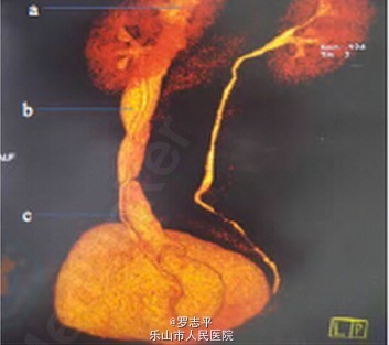超声:左上重复肾畸形,伴重度积水左输尿管扩张;CT尿路造影(CTU):左肾上中极6.2 cm×5.8 cm×6.0 cm类圆软组织影(如图)