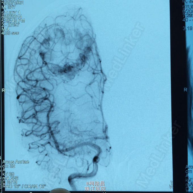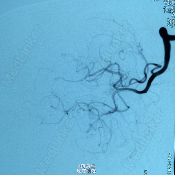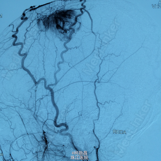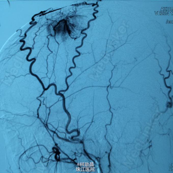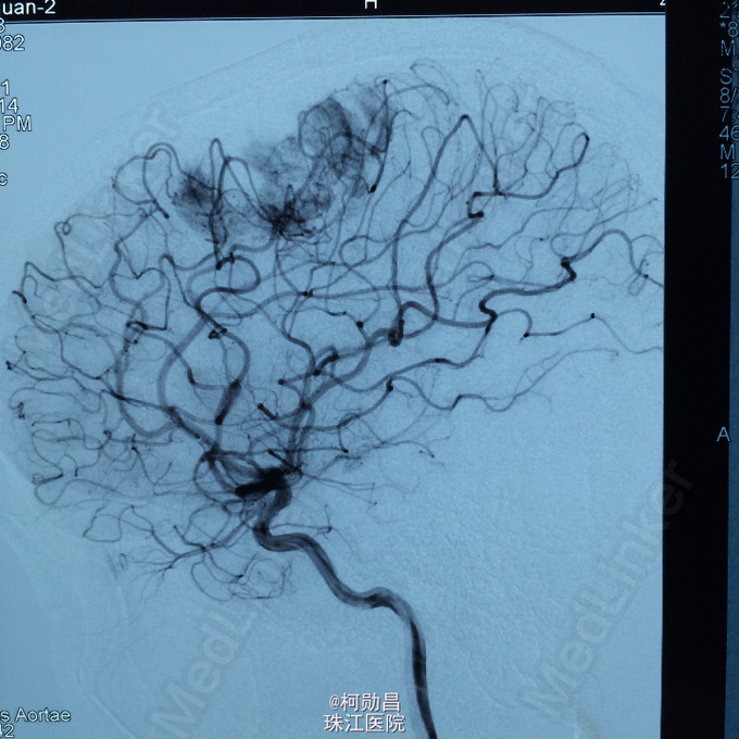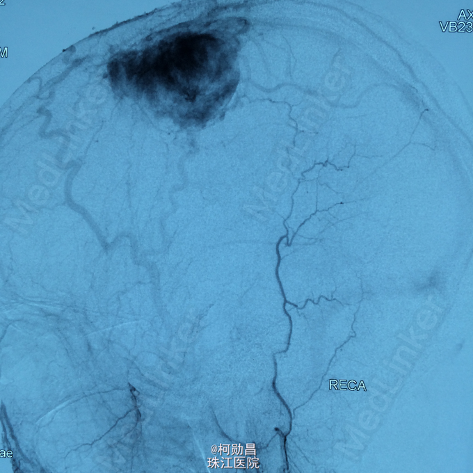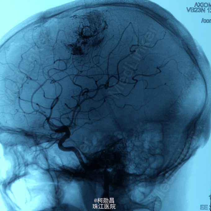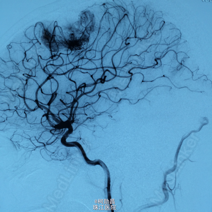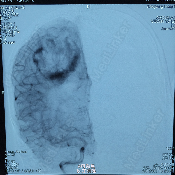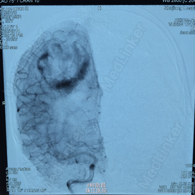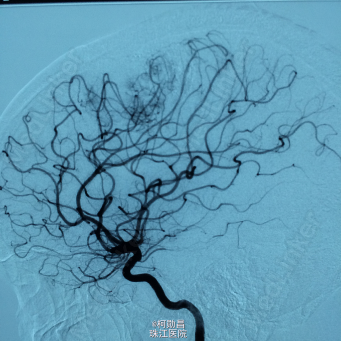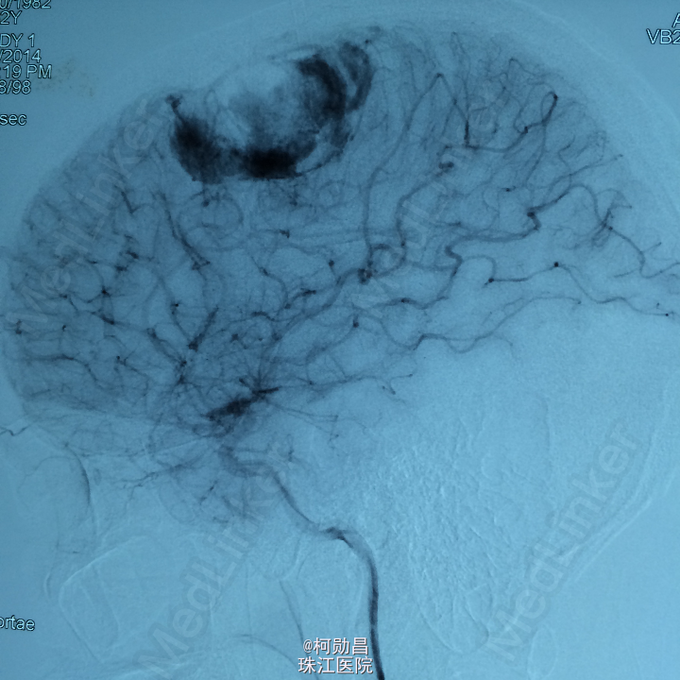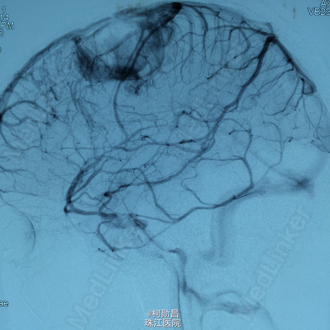 诊断:左侧顶叶占位 处理:行DSA检查,提示肿瘤染色,予PVA颗粒行血管内栓塞治疗。