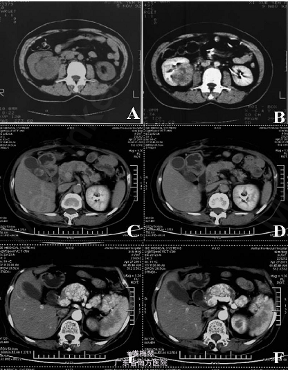 患者,女,7 0 岁。因“右肾切除术后1 9 年,发现胰腺占位8 年”于2011 年5 月4 日入院。患者19 年前曾因右肾肿瘤行根治性肾切除术,病理报告为透明细胞癌,术后予放疗和IL免疫治疗。2003年体检B超发现胰腺占位,大小2.3cm×0.9cm,怀疑良性病变,一直保守治疗,定期复查彩超,增大不明显。曾于2008 年3 月和2009 年6 月分别行两次PETCT检查,胰腺未见明显异常密度。2011 年4 月27 日再次行CT 检查提示胰体尾实质性病灶,胆囊结石,怀疑恶性可能。病程中患者无腹痛、腹泻、发热症状,自感纳差、乏力,体重减轻约7~8 kg。