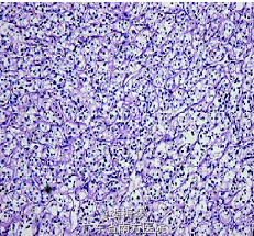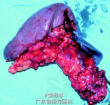 临床诊断:胰体尾部占位;右肾切除术后。 于2011年5 月15 日在全麻下行剖腹探查术,术中探查见无明显腹水,上腹部粘连明显,肿块位于胰腺颈部和体尾部,最大病灶5cm×5cm,质硬,周围淋巴结无明显转移,胆囊慢性炎性改变,胆囊内扪及结石,肝脏质软,未见转移灶,遂行胰体尾+ 脾+胆囊切除术。 术后病理诊断为:胰腺转移性肾透明细胞癌。