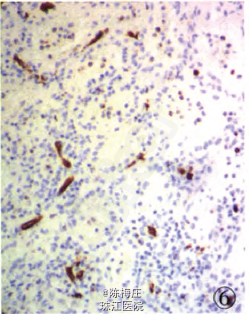 初步诊断:子宫肌瘤,子宫腺肌病,盆腔多发肿物性质待查。 确定诊断:盆腔腹膜脾组织植入。 完善相关检查,行全子宫切除术。病理检查:眼观:全切子宫1个,13 cm×8 cm×5.5 cm大小,子宫做多个切面,在肌层内查见2个大小不等灰白色肌瘤,肌瘤面积O.3 em×0.2 cm—l cm×0.66cm,肌瘤切面质韧,灰白色,呈编织状,边界清;内膜光滑,厚0.2—0.3 em,肌层厚2.5—3.5 cm,部分呈海绵状,子宫颈光滑,切面质韧,质地较细。盆腔内不规则肿物1个,灰红色,表面结节状,11cm×7.5 cm×3.5 cm大小,做多个切面,切面见多个结节,结节面积:0.4cm×0.3 cm~4.3 cm×2.5 cm,结节切面质脆,灰红色,质地细,结节边界清。另送圆形结节5个,直径1~3 cm不等,切面性质同盆腔较大肿物,均有包膜(图1)。镜检:患者子宫检查为子宫肌瘤,子宫腺肌病,病变无特殊性。盆腔多个肿物病变性质基本一致,为扩张血窦样组织,窦腔内充满红细胞,似脾红髓淤血(图2),在血窦样组织间有大小不等、发育良莠不齐的白髓样结节,结节较大者有小中央动脉(图3),结节较小者中央动脉不明显,内皮细胞无异型性,细胞分化均无异性,无病理性分裂象。可见玻璃变性纤维结缔组织似脾小梁样结构(图4)。免疫表型:血窦样内皮细胞nFli-1强阳性(图5),CD31弱阳性;CD34肿物小血管强阳性而血窦内皮细胞阴性(图6),CR和SMA均阴性;Ki-67增殖指数为5%。