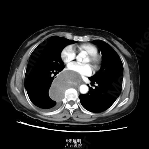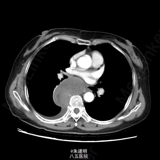【主诉】 胸部不适1月 【现病史】 患者1月前于当地医院常规体检发现纵隔部占位,为明确诊断,遂来我院门诊就诊。门诊行CT检查(2015-05-07)示:右后下纵膈占位,梭形细胞肿瘤(神经源性等)机会大,右侧少量胸腔积液;左肺炎性小结节机会大,随访。门诊拟诊断为“右侧纵隔占位”收入我科。患者病程中,一般情况可,胃纳二便无殊。