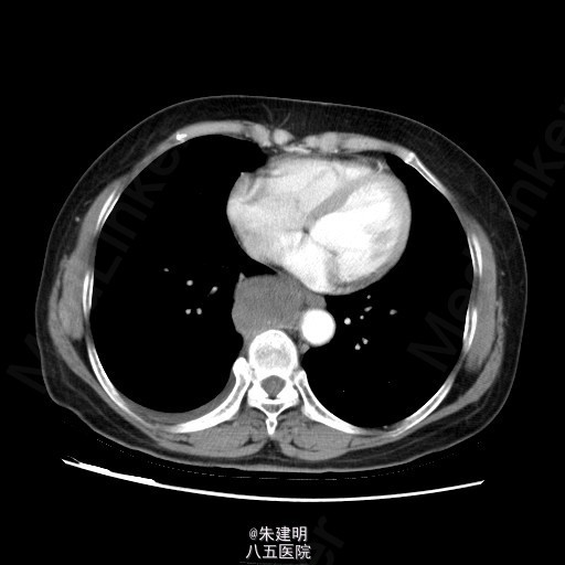 查体: T:36.6℃ P:78次/分 R:20次/分 BP:120/80mmHg 神清,一般可,双侧锁骨上淋巴结未及肿大;胸廓无畸形,呼吸运动平稳,胸廓活动度可;两肺呼吸音清,未及明显干湿罗音。 辅助检查: 门诊行CT检查(2015-05-07)示:右后下纵膈占位,梭形细胞肿瘤(神经源性等)机会大,右侧少量胸腔积液;左肺炎性小结节机会大,随访。