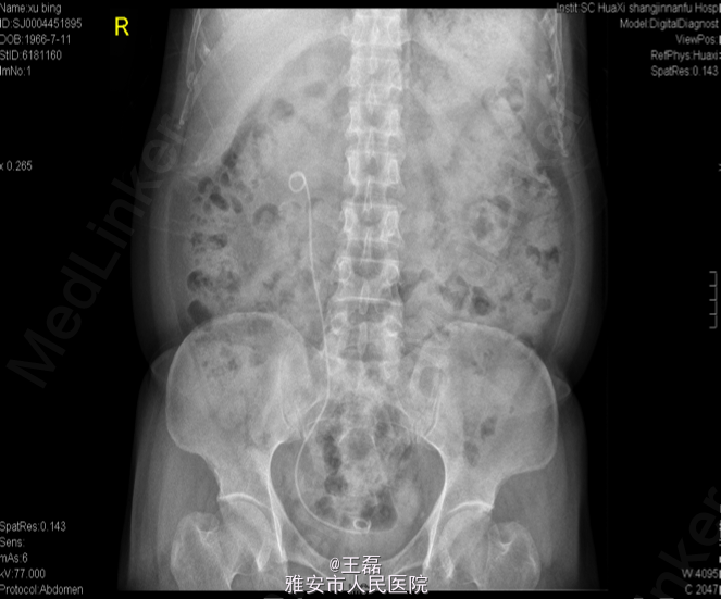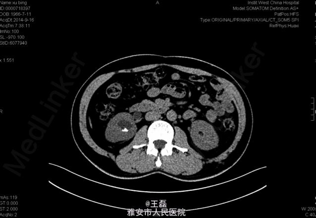 诊断为右肾下盏结石; 手术:右侧输尿管软镜钬激光碎石取石术