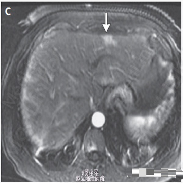 查体:BP190/97mmHg,其余生命体征正常。腹软,于右上腹可触及柔软肝脏边缘,未及肝脾肿大或腹胀。余查体正常。肝脏MRI增强发现右叶9.4cm×12.3cm×8.5cm异质性增强肿块。另有一处在第七段发现5mm病变,考虑可能为转移灶;余肝右叶多发小病灶考虑为血管瘤。(图1-3) 血浆皮质醇水平为23.5μg/dL(648 nmol/L)(参考值5-15μg/dL);血管活性肠多肽32pg /mL(参考值小于75)。入院第二天行SPECT,提示肝右叶大范围喷曲肽再摄取降低,符合MRI所示。