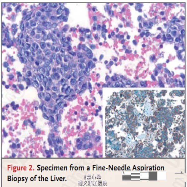 患者有结肠癌的家族史,58岁且没有做过肠镜,因此建议对此患者行结肠镜检查。结果发现一处盲肠肿块,并进行了活检。病理提示:细针活检标本是细胞学标本,可见簇状肿瘤细胞与血液混合。肿瘤细胞紧密排列,体积较小到中等,胞核/胞浆比值很高,粉红色细胞质很少。核仁椭圆,核分裂像多见。 本例患者较特殊。尽管我们怀疑原发灶来自结肠,但不能明确。另外,本例为低分化神经内分泌癌,而非典型腺癌,我们不确定化疗会起作用。起初病变似乎主要在右叶,然而门静脉分叉受累,左叶很可能有小的,难以界定的转移灶。 因此我们选择先行腹腔镜探查,在化疗前切除结肠肿瘤。术中发现90%肝右叶受转移累及,活检证实左叶同样有转移。患者伴有腹水。