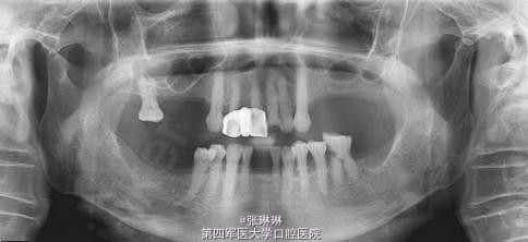 口内检查及全景片检查:14、15、16、24、25、26、27、31、37、41、46、47牙缺失,17、32、34、35、36、42、44、45牙慢性牙髓炎。