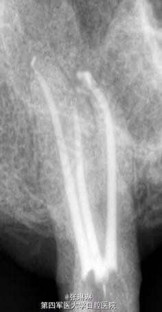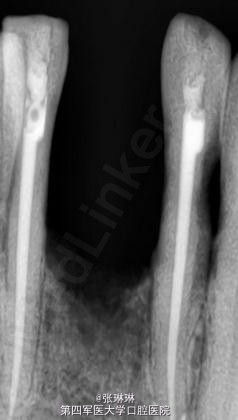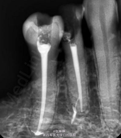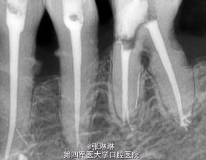 根据龋坏程度、患者的症状、修复需要,且对收费及牙髓处理均征得同意后第一次行右下4、5,左下4、5、6;第二次行左下2,右下2 ,右上7一次性根管治疗术, 术后见右下4,左下4均有侧支充填,且位置对称,左下6近中根中部有侧支;左下5、左下6远中根管均多个开口。 热牙胶垂直加压后有封闭剂和牙胶超填,但无术后反应。
