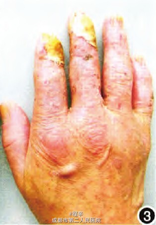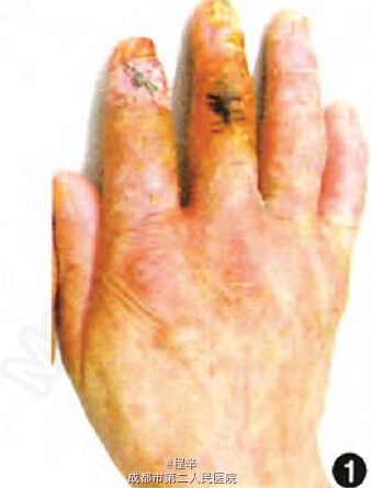 诊断:慢性放射性皮炎继发鳞状细胞癌。 治疗:给予阿维A 10 mg,每天2次口服,局部对症予以莫匹罗星软膏、复方泼尼松软膏、尿囊素外用。嘱患者注意手部保暖及避免外伤、感染。治疗2个月后随访,右手肿胀基本消退,溃疡基底清洁,愈合尚可,手部其他部位皮损明显改善,治疗期间检测肝肾功能及血脂均在正常范围。目前,患者仍继续口服阿维A 20 mg/d,双手掌角化脱屑继续好转,原有皮损无发展,亦无新发皮损出现,但原溃疡处难以愈合,请本院外科会诊,建议择期手术切除病变处并予以植皮。