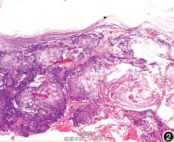 已有研究表明,阿维A对于基底细胞癌、鳞癌、Bowen病及日光性角化病等多种皮肤肿瘤及癌前期病变均有较好的疗效。考虑到本例患者放射性皮炎主要表现为角化性皮损,皮损广泛且继发恶变,但癌肿侵犯不深,全部手术切除创伤太大,我们予以低剂量阿维A长期口服,显示了较好的疗效。