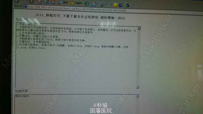T:36.5℃,P:80次/分,呼吸:16次/分,血压130/80mmHg. 一般状态可,发育正常,表情自如,被动体位,查体合作,全身皮肤粘膜无黄染,无皮疹及皮下出血,全身浅表淋巴结未触及肿大。双肺扣诊清音,呼吸音清,未闻及明显干湿罗音及胸膜摩擦音。心率80次/分,心音未见异常。腹部平坦,未见胃肠型及蠕动波,肝脾肋下未触及。生理反射存在,病理反射未引出。 专科情况:患者双下肢肌力4-5级,左膝压痛+,反跳痛-,右膝压痛-,反跳痛-。双膝活动伸直,屈曲未见明显受限,双下肢膝跳反射,跟腱反射未见明显异常。 下肢x片:双膝胫股关节间隙变窄,外侧间隙变窄明显,关节面下骨质硬化,骨质囊变,关节边缘骨赘形成,双侧股骨内外髁边缘性骨赘并骨质浓密不均 胫骨间隙似见游离体。