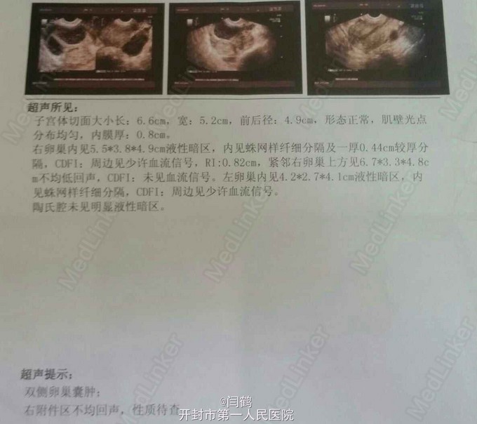 B超示:双侧卵巢囊肿,右附件区不均回声,性质待查,右卵巢内见5.5*3.8*4.9液性暗区,内见蛛网样纤细分隔及一0.44Cc较厚分隔,紧邻右卵巢上为见6.7*3.3*4.8不均低回声,左卵巢内见一4.2*2.7*4.1液性暗区。 辅检:血β-HCG:188 专科情况:外阴:正常,阴道:畅,宫颈:轻糜,盆腔:可及女拳大小包块,子宫与附件分界欠清。