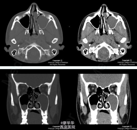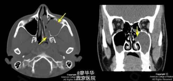 查体可见患者有鼻塞、流脓涕并伴有头晕症状,检查可见鼻粘膜慢性充血肿胀并伴有脓性分泌物 辅查 CT