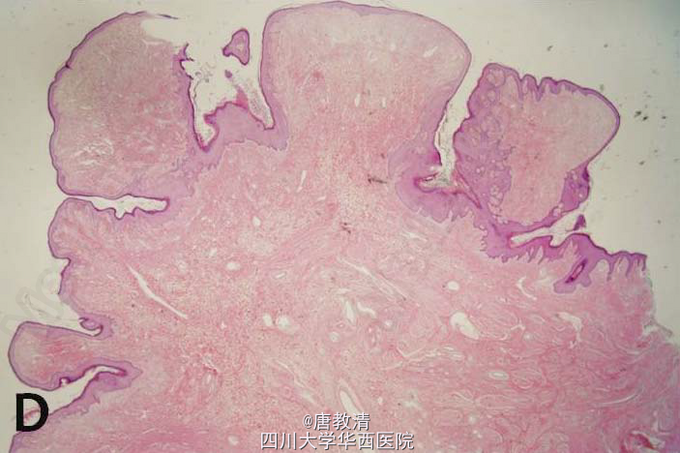 软纤维瘤是一种良性肿瘤,常见于中年或老年。通常可分为3型:①多发性皱纹状小丘疹,质软,直径1mm~2mm;②单个或多发性丝状软纤维瘤,呈丝状增生的柔软突起,宽约2mm,长约5mm;③单发性有蒂软纤维瘤,一般为单个有蒂呈息肉样突起,质软,表面光滑,直径约1cm或更大,常呈肤色或色素增多。 此病例临床表现特殊,非软纤维瘤典型表现,皮肤镜检查和组织病理检查是有必要的。不然容易误诊为脂溢性角化病、多形性纤维瘤、乳头乳晕状角化过度症和寻常疣等。