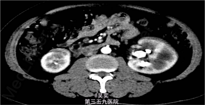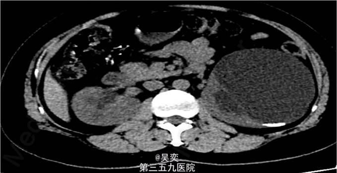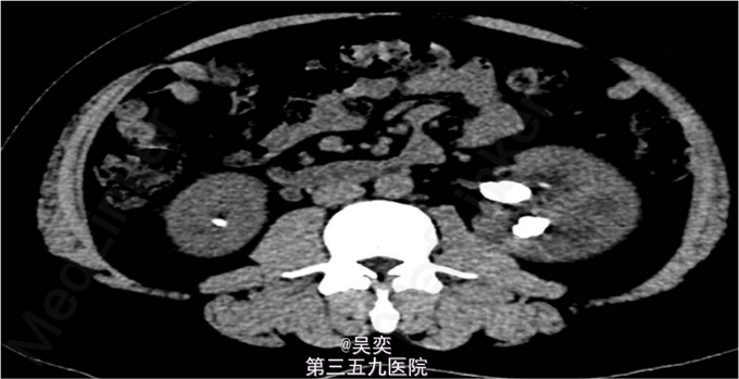 3、查体:无阳性体征 4、辅助检查:我院泌尿系B超:右输尿管上段结石并上段扩张,双肾多发结石。入院后白细胞总数10.550x10E9/L,中性粒细胞绝对值6.970x10E9/L。尿常规:白细胞计数50.30个/ul,红细胞计数145.70个/ul。生化全套:谷丙转氨酶75.000U/L,谷草转氨酶44.000U/L。双肾CTU:1、左肾盂和中下盏铸型结石较前稍增多,左肾中度积水。2、右肾多发结石,右肾中度积水,右侧输尿管上段炎症。3、左肾上极巨大囊性病变较前增大,考虑扩张的肾盏,内有结石。4、盆腔多发静脉石。5、前列腺小钙化灶。其余术前常规抽血结果无特殊。