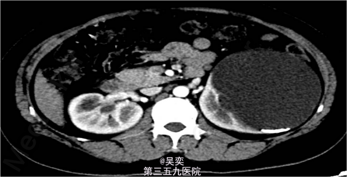 5、诊断:肾积水伴输尿管结石,肾结石,精神分裂症 6、入院后完善相关检查,心电图、胸片未见异常,CT示:1、左肾盂和中下盏铸型结石较前稍增多,左肾中度积水。2、右肾多发结石,右肾中度积水,右侧输尿管上段炎症。3、左肾上极巨大囊性病变较前增大,考虑扩张的肾盏,内有结石,排除手术禁忌症,经术前准备,于左侧经皮肾镜碎石取石术,手术顺利,术后恢复较好。