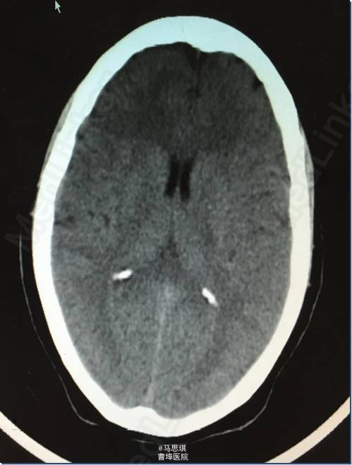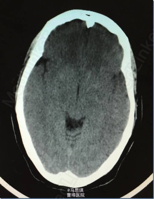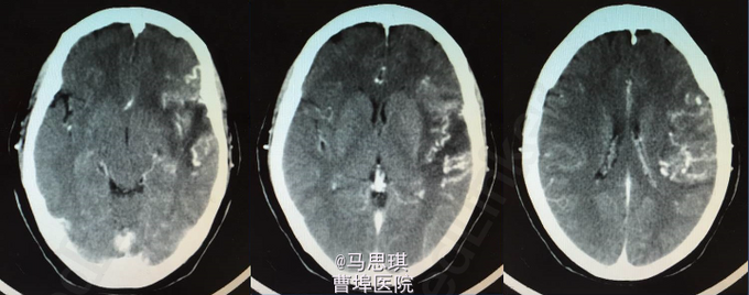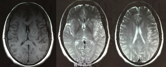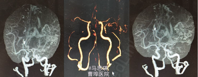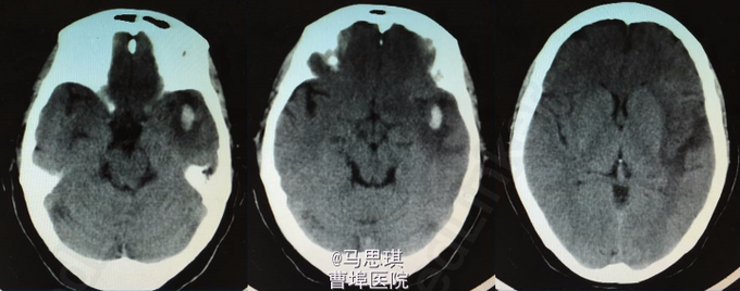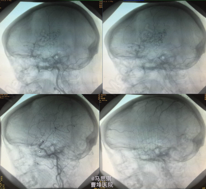 入院诊断为:“脑梗塞?” 患者有溶栓指征,但患者家属拒绝溶栓。 治疗: 氯吡格雷75mg Qd 拜阿司匹林0.1 Qd 立普妥 20mg qd 胞磷胆碱0.2tid 依达拉奉30mg ivgtt bid 康复治疗 入院第二天行MRI及MRA检查。 头部MRI:左侧额颞岛叶见片状稍长T2稍长T1信号灶,其内见较多增粗、增多血管影,原因?考虑:血管畸形所致左侧额颞岛叶缺血梗塞性改变?血管炎性病变或脑炎待排? 头颅MRA:左侧额颞岛叶见较多增粗、增多的血管影,右侧额颞顶交界区血管影稍增多。左侧胚胎型大脑后动脉。 入院第四天行头颅增强CT及CTA。 头颅增强CT:左侧颞叶见片状低密度影,其内见大小约0.7x1.6cm片状高密度影,与前片比较,见范围加大,考虑系梗塞后伴出血,血管畸形。增强扫描见左侧额颞叶较多迂曲扩张的血管影。 CTA:左侧额颞岛叶区域见大脑中动脉岛叶段,侧裂段及分叉段分支明显增多,部分迂曲、扩张,呈杂乱走行的血管团样改变,考虑血管畸形可能;右侧额顶交界区血管影稍增多。双侧颈内和基底动脉及大脑前中后动脉显示清晰,其大小、走行、信号未见确切异常,各血管壁光整,管腔未见确切狭窄,走行自然。 发现出血后,停用双联抗小板治疗,并加做DSA DSA示:左侧颈外动脉分支脑膜中动脉血管畸形,与颈内动脉,椎动脉无明显交通 修正诊断为: 左侧额颞岛叶脑梗塞并梗塞后出血; 左侧脑膜中动脉血管畸形 动脉粥样硬化症 上呼吸道感染