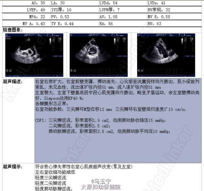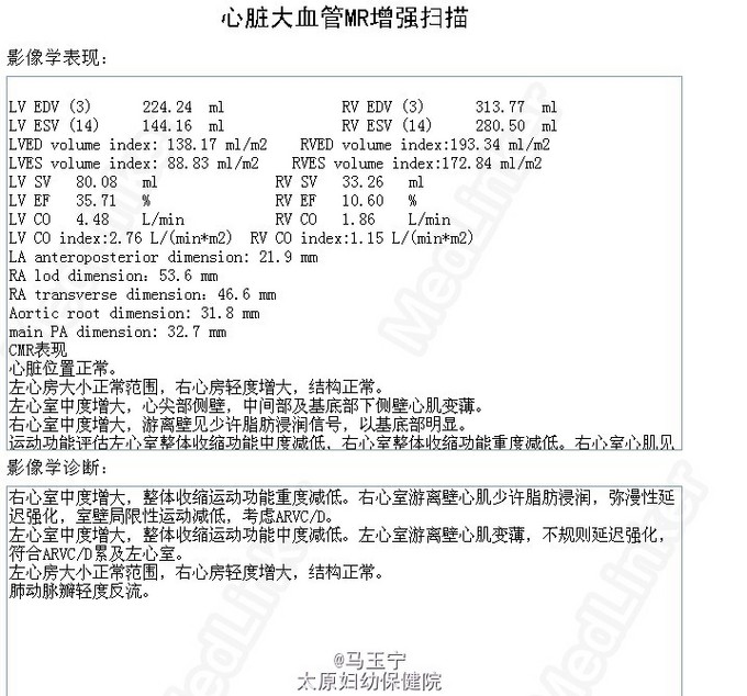 诊断:1)致心律失常性右室心肌病 2)窦性心动过缓 3)频发室性早搏(多源) 4)阵发性室上速 5)阵发性室速 处理:根据患者病史,心电图,心脏超声及心脏MRI,目前诊断致心律失常性右室心肌病明确,心脏超声提示左右心室均受累,建议患者植入双腔起搏器(ICD)+射频消融术,因费用问题,患者最终选择单腔起搏器植入。