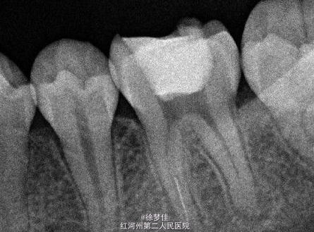 左下6近中根管断针X-P,断针长度约4MM, 根尖慢性炎症