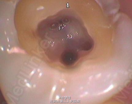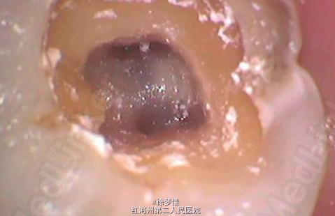 插针确定断针根管,为近舌根管,插针有阻力,EDTA封存一周复诊。打开根管上部通路,根管大量清洗剂等冲洗,找到后,直接用超声根管搓15号带出断针。